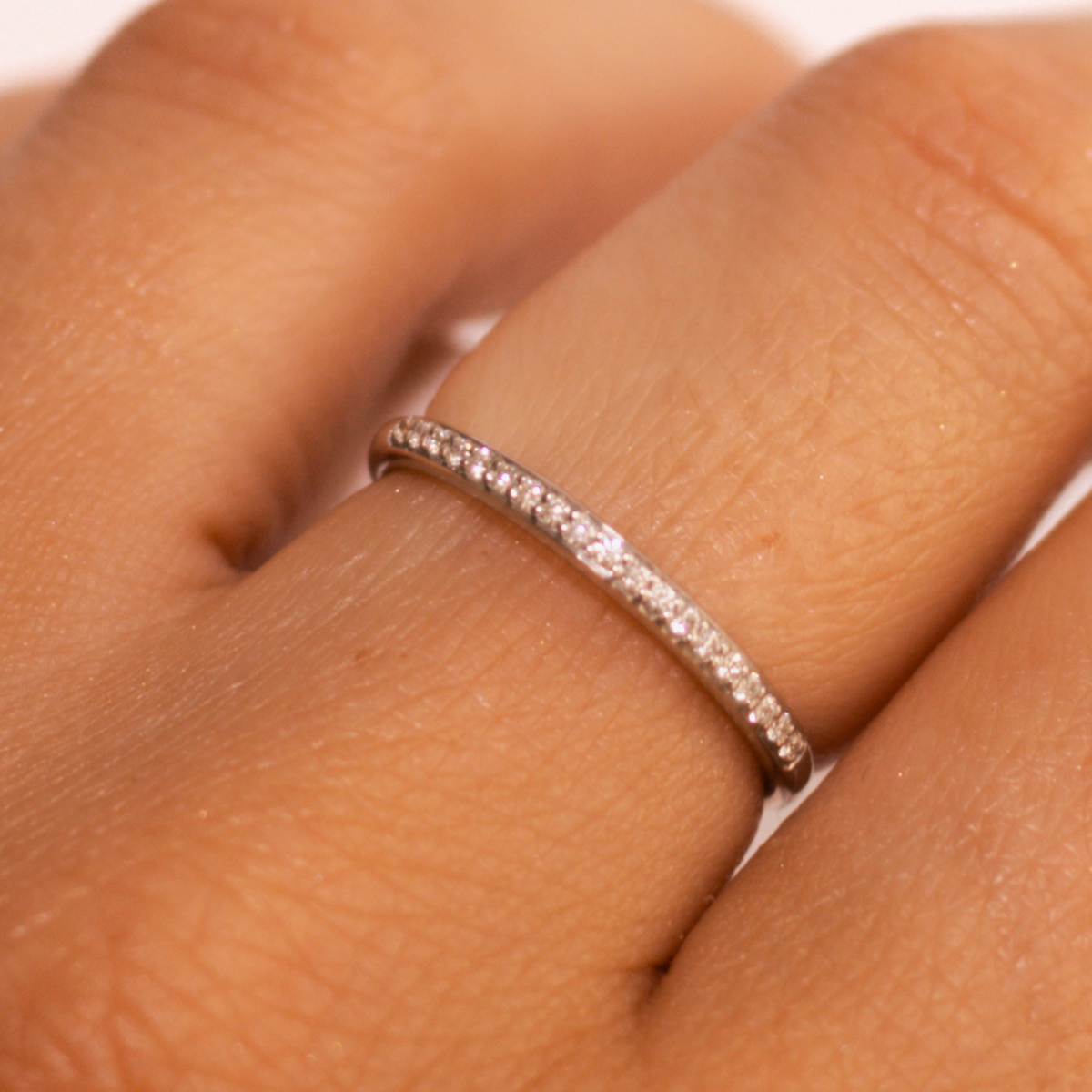 The Alliance Ring in 14K white gold features a delicate 0.13 ct row of brilliant-cut diamonds, offering timeless elegance and understated sparkle. With a refined 1.8 mm width and polished finish, this minimalist ring is perfect as a symbol of commitment, a stacking piece, or a sophisticated everyday accessory by Clemance.